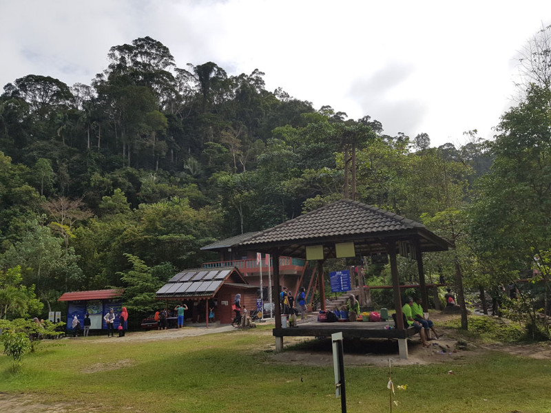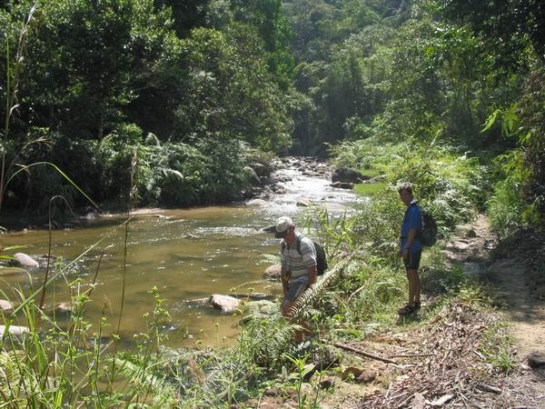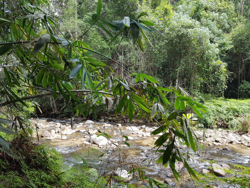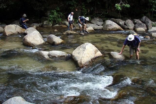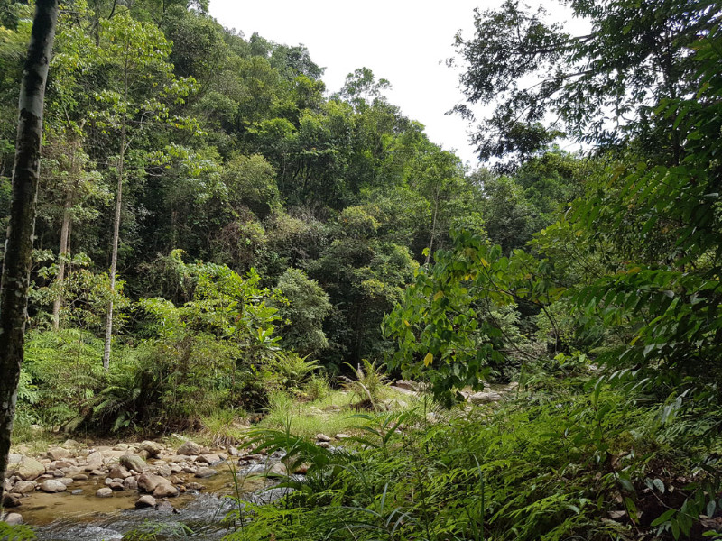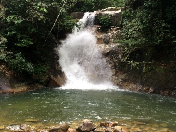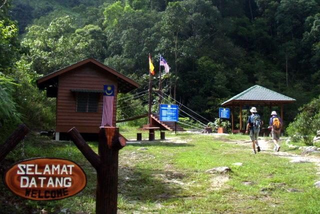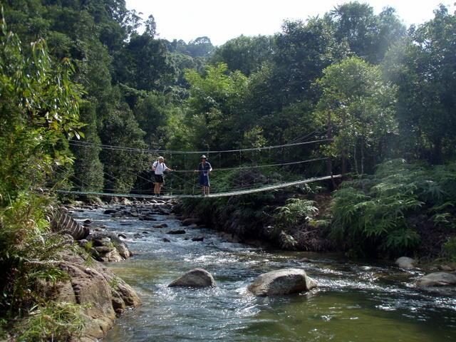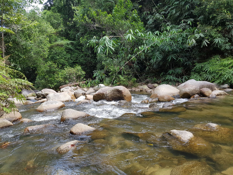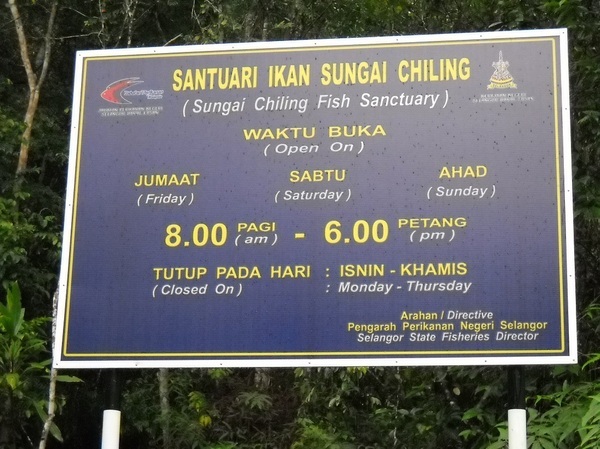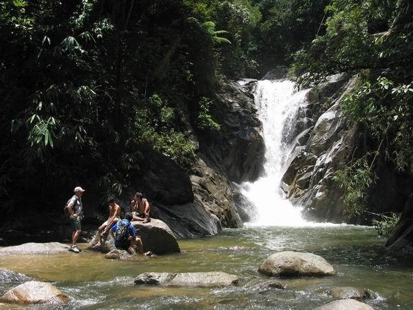 The Chiling Falls are probably the most beautiful waterfalls of Selangor. They can be reached after an adventurous trek along the river, which has to be crossed many times. To reach the trail head, you take the road from Kuala Kubu Baru to the Gap. After passing the Selangor Dam, you cross the bridge on the Chiling river. Just after this bridge you can park you car. Follow the road for about 100 meter, the trail head is clearly indicated. Soon you will arrive an open field beside the river, with some buildings and a campsite, maintained by the Fisheries department.